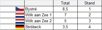 Ergebnisstand nach Runde 4 : Bystre 4,5 Punkte, Ströbeck 4,5 Punkte und Wijk aan zee 3 Punkte.